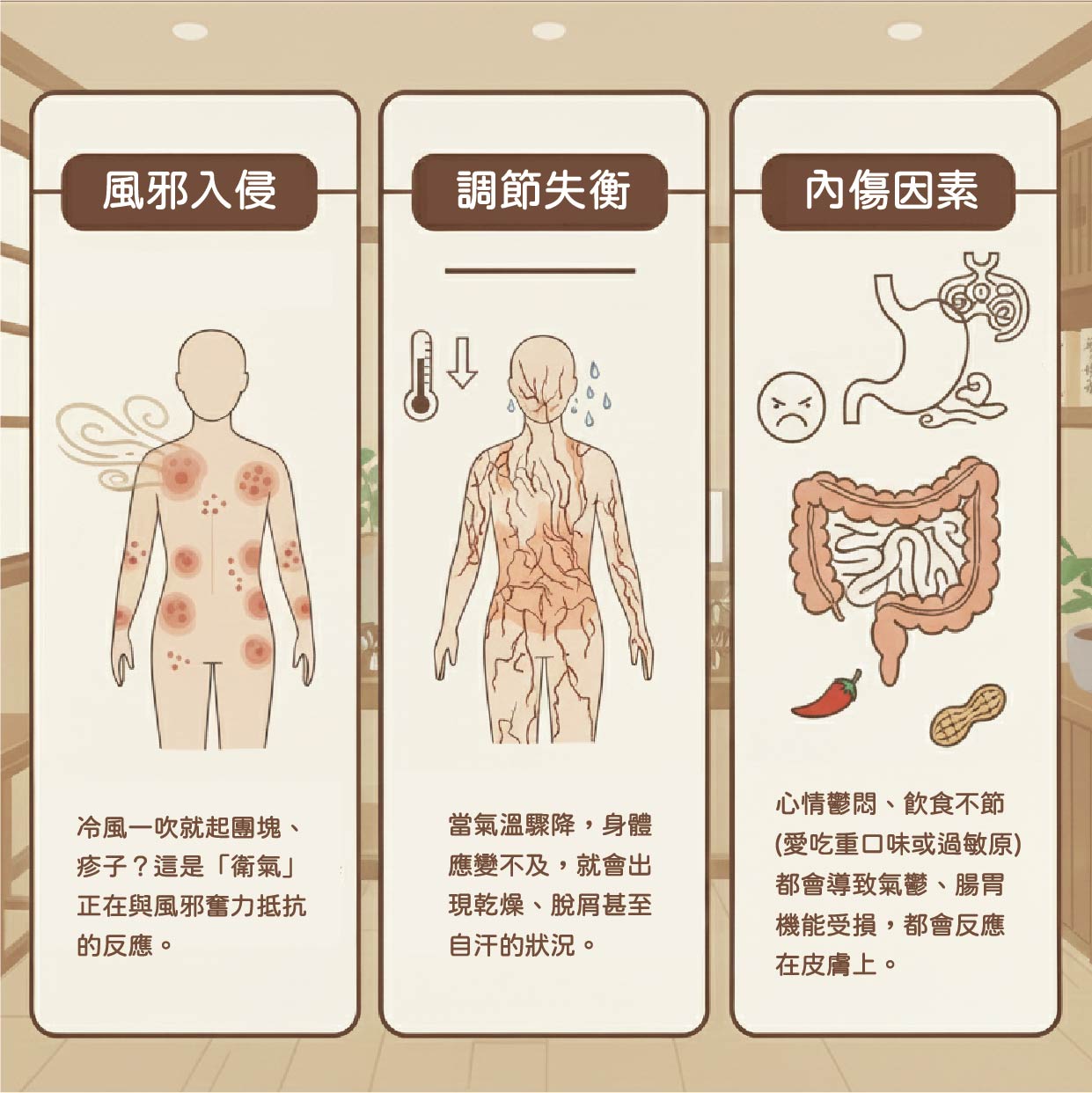 風邪入侵: 吹到冷風,身體「衛氣」抵抗不及,引發團塊斑疹。
